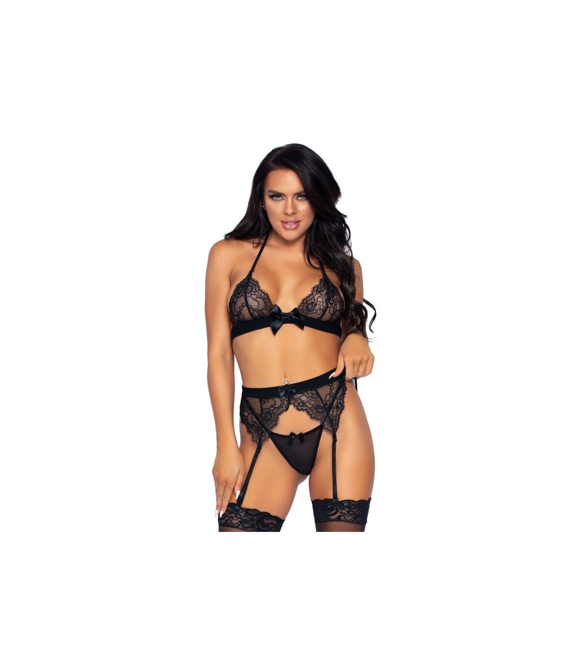 3 pzs. Conjunto que incluye un sujetador de encaje con pestañas, un liguero y un tanga. Con Leg Avenue reforzarás tu feminidad y obtendrás ese toque justo de seducción, sensualidad y elegancia.