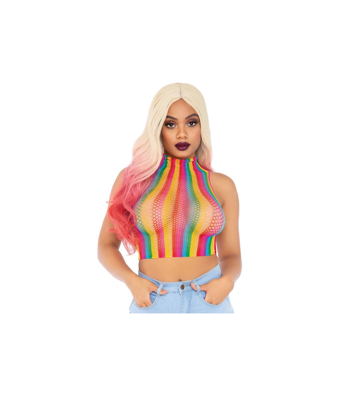 El top corto de cuello alto con red arcoíris es una prenda vibrante y llamativa, diseñada específicamente para destacar en festivales y eventos donde la expresión personal y la moda se fusionan en una celebración de color y estilo. Este top combina elementos de diseño moderno con una estética festiva, creando una pieza que es tanto funcional como visualmente impresionante.