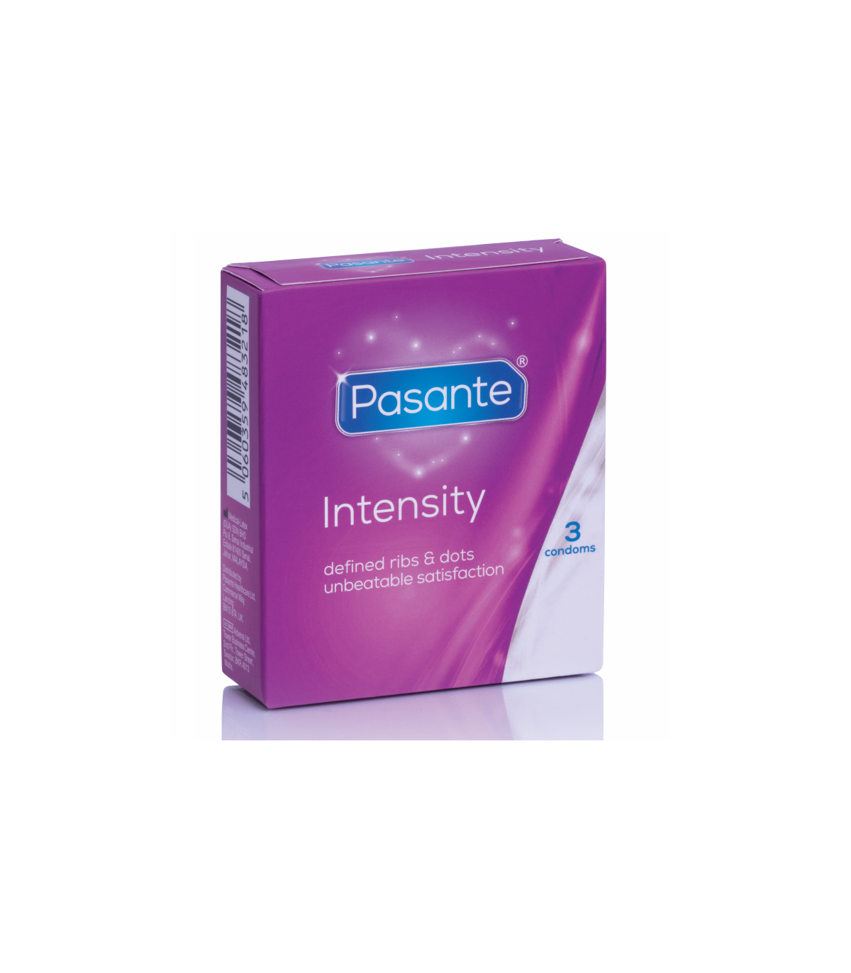 Los condones Pasante Ribs & Dots Intensity son condones cónicos, texturizado con nervaduras pronunciadas y puntos. De color natural.