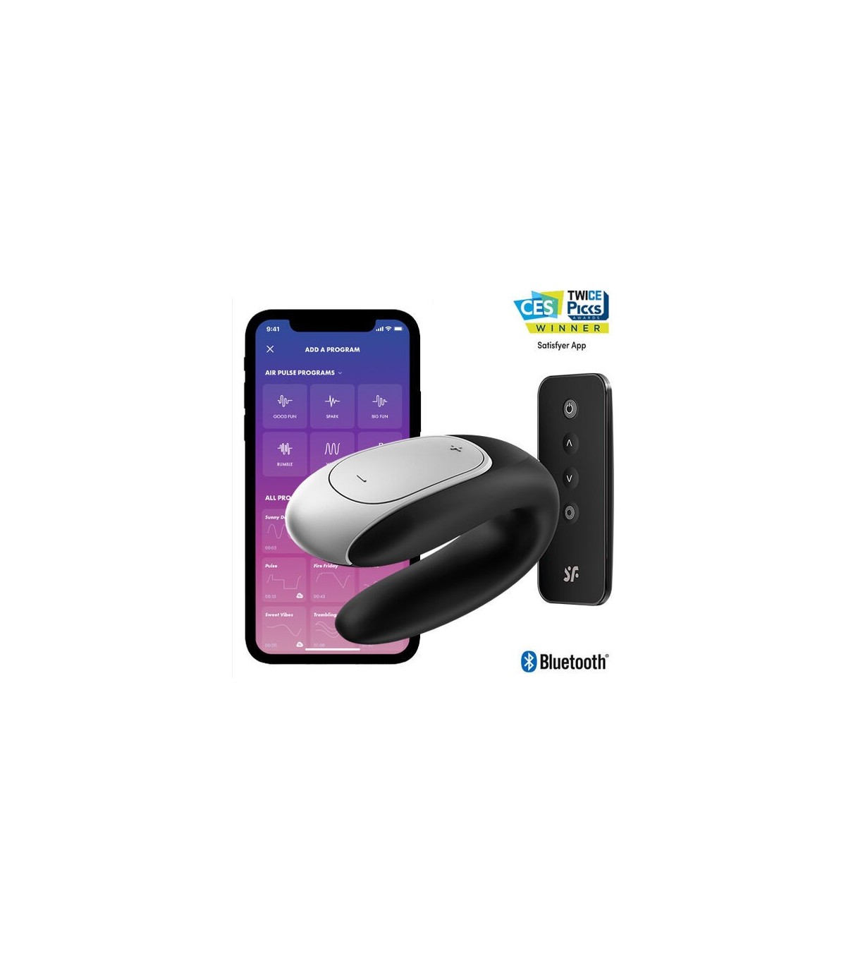 También cuenta con un control intuitivo: Los diferentes programas de vibración se pueden controlar mediante los botones de control del propio vibrador para parejas, con el control remoto inalámbrico incluido o a través de la aplicación Satisfyer Connect. A través de la aplicación podrás descubrir todavía más posibilidades de mejorar el juego sexual: Tienes la posibilidad, entre otras cosas, de crear tus propios programas de vibración, asumir el control del Satisfyer de tu pareja o conectar la cuenta a Spotify: ¡hay tanto por descubrir! La aplicación es gratuita y está disponible para Android, iOS y Apple Watch.