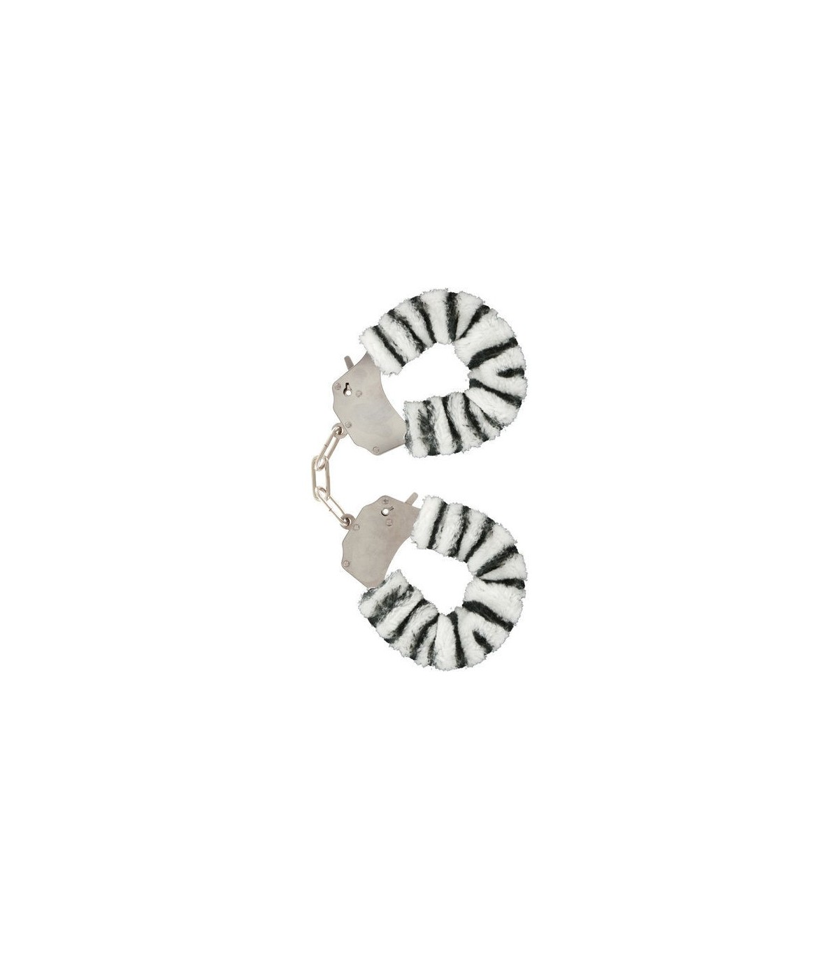 Fabulosas espoesas de muñeca de dos piezas unidas con una cadena de acero cromado, recubiertas con un suave peluche alrededor de los puños de color Zebra