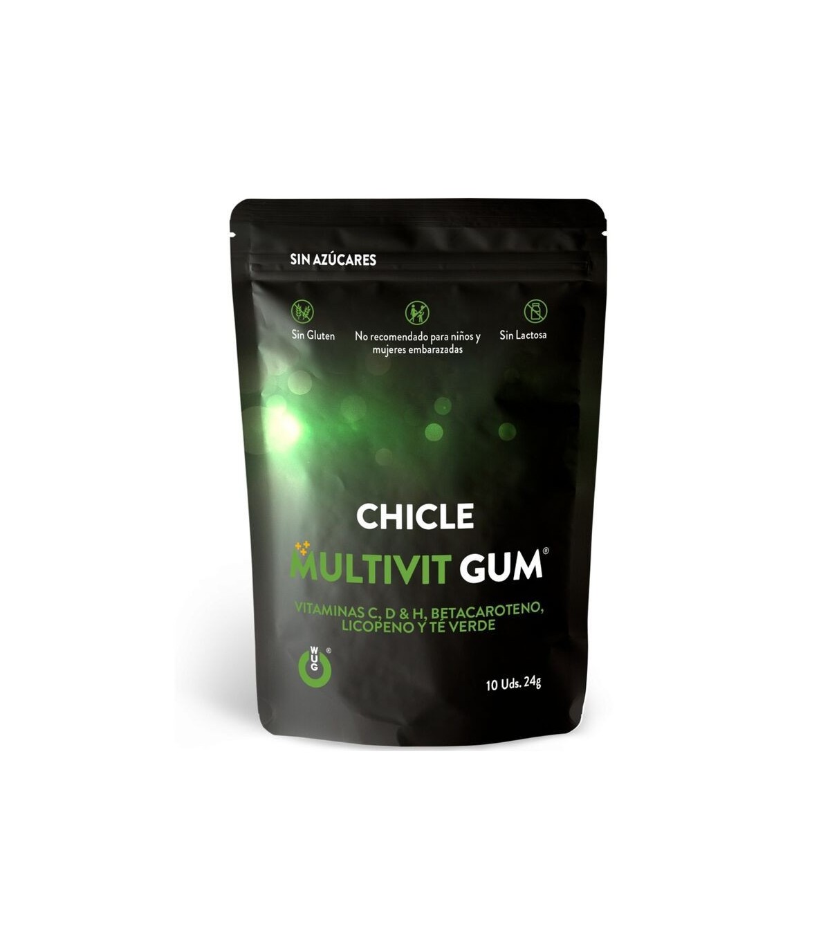 WUG CHICLE MULTIVIT GUM, es un complemento alimenticio, en formato chicle, sin azúcar y con un agradable sabor tropical. Es un complemento ideal que ayuda a resistir las agresiones externas, contribuyendo al funcionamiento normal del sistema inmunitario. Está compuesto por Betacaroteno, Licopeno, Té Verde y Vitaminas C, D y H que contribuyen a la protección de las células frente al daño oxidativo.