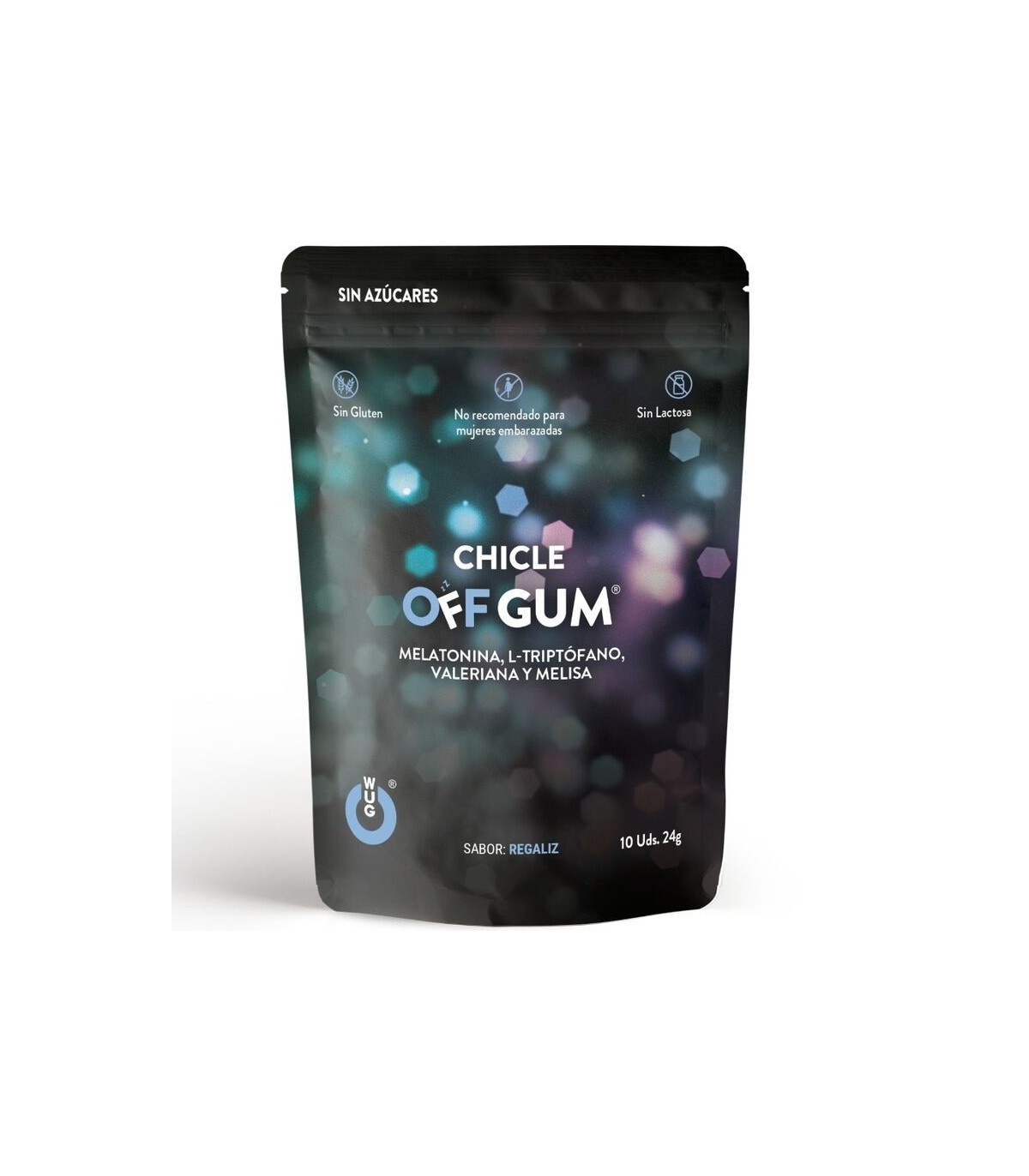 Chicle OFF GUM, es un complemento alimenticio con edulcorantes ideal para ayudar a conciliar el sueño. Está compuesto por Extracto Valeriana, Melisa, L-Triptófano y Melatonina posee un agradable sabor a menta suave. WUG Relax no necesita agua, ni digestión, se puede llevar en cualquier sitio y sólo pesa alrededor de 2 gramos. Lo puedes encontrar en packs de 10 unidades.